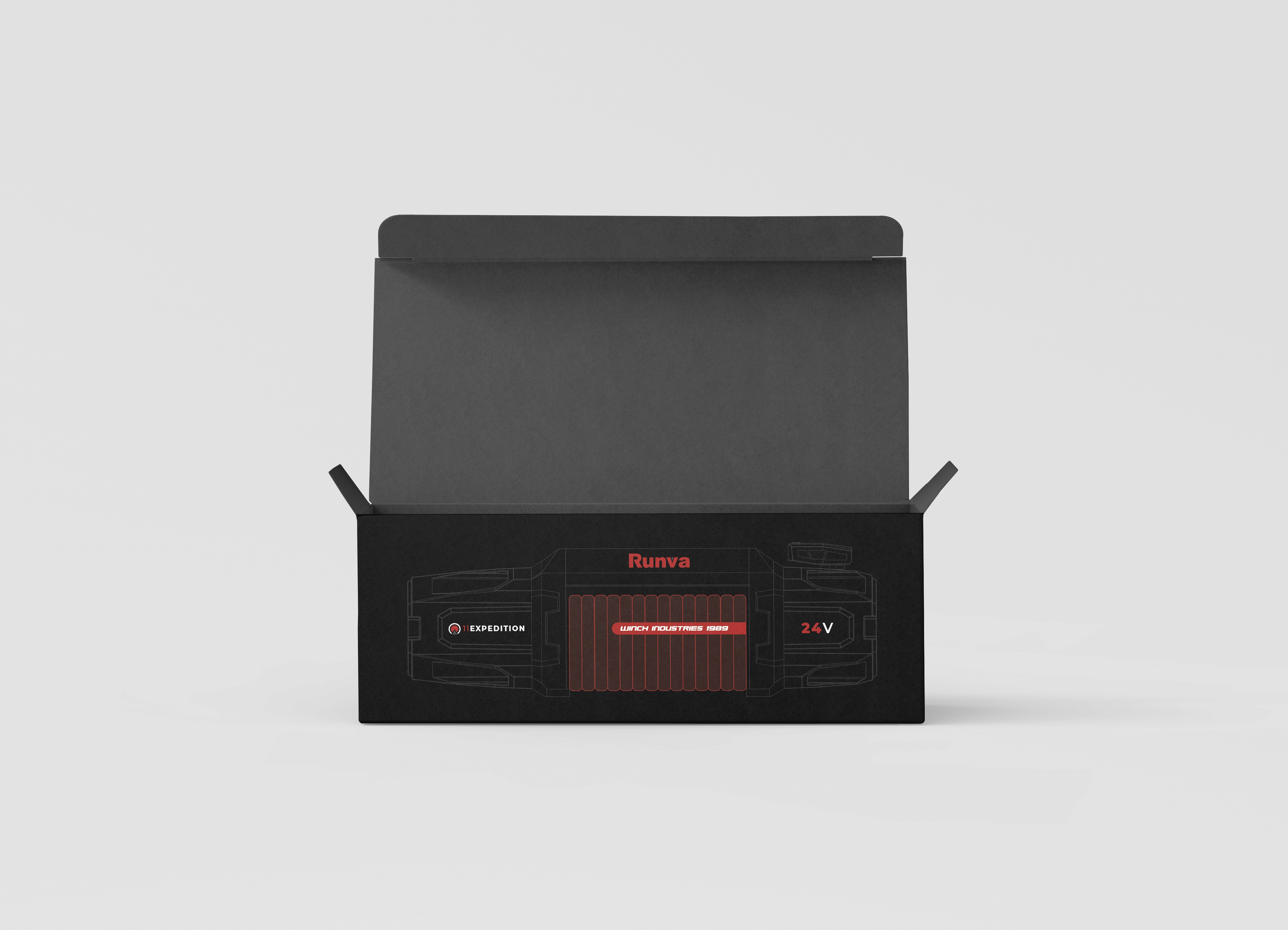 The final design features an outlined illustration of the winch on the front of the packaging, finished with spot UV detailing. This element functions both as a visual highlight and a subtle dimensional drawing, adding depth while maintaining a clean, restrained aesthetic. The result is a considered blend of existing brand elements and new design thinking, positioning the EXPEDITION range as a clear step forward for RUNVA’s next generation of products.